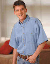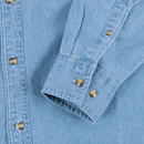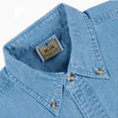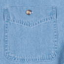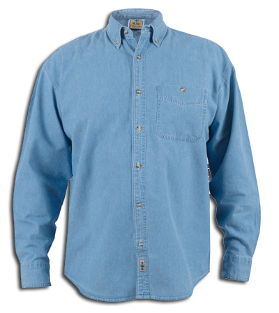 ice blue 6.5 oz 100% cotton, denim shirt. Button down collar with left